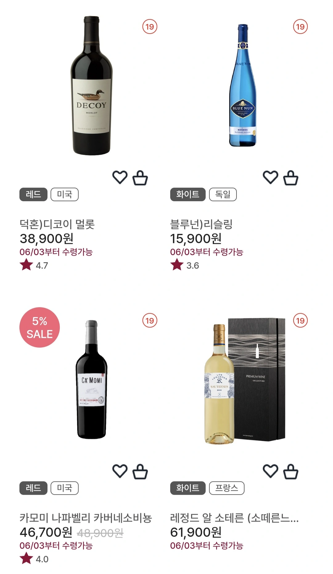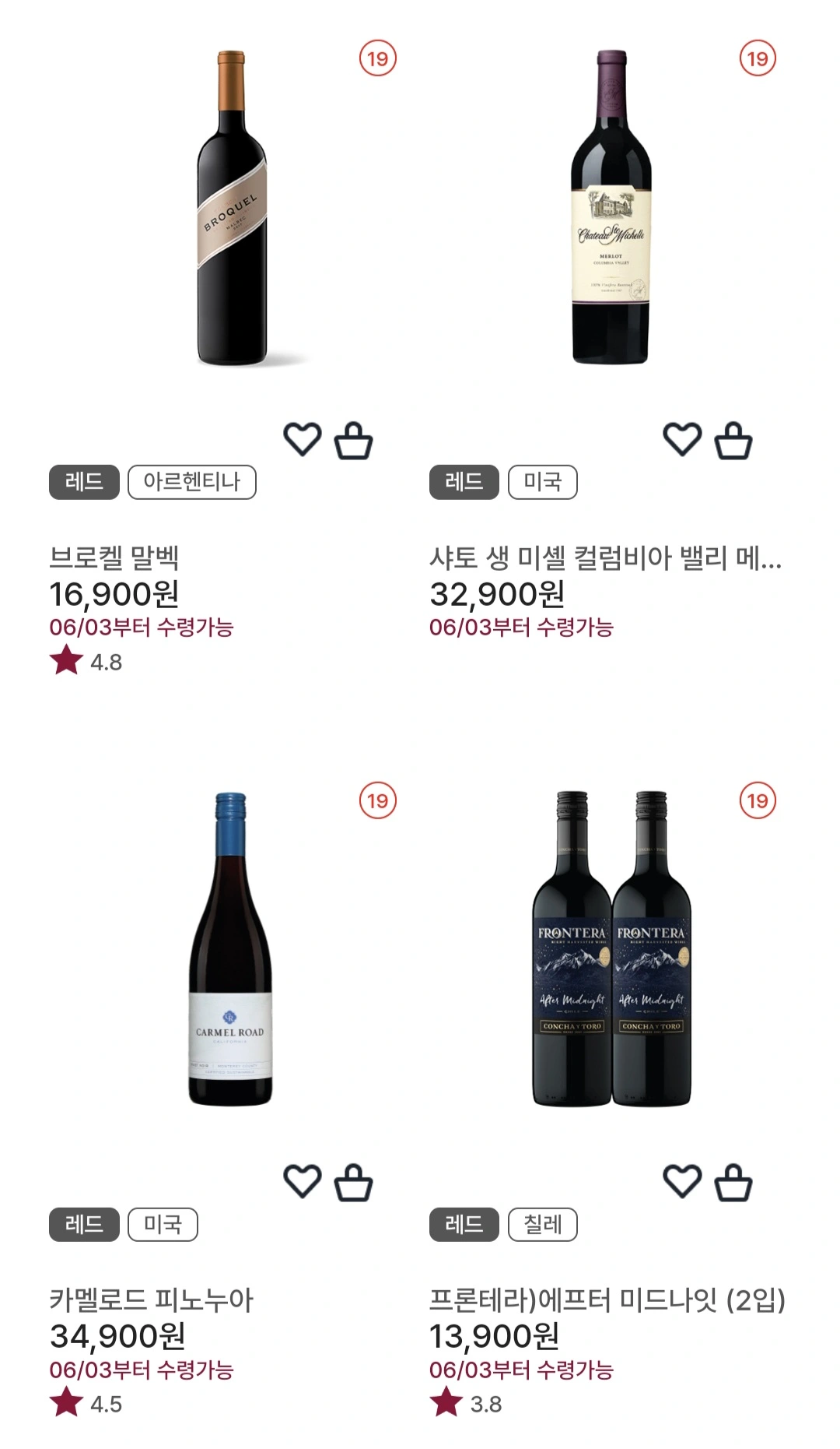 카멜로드 피노누아를 기존 판매가인 34,900원에서 20% 할인 적용하면 27,920원에 구매하실 수 있고, 덕혼 디코이 멜롯이나 샤또 생 미셀 컬럼비아 밸리 멜롯, 브로켈 말벡도 쿠폰을 적용하면 저렴한 가격에 구매하실 수 있습니다.